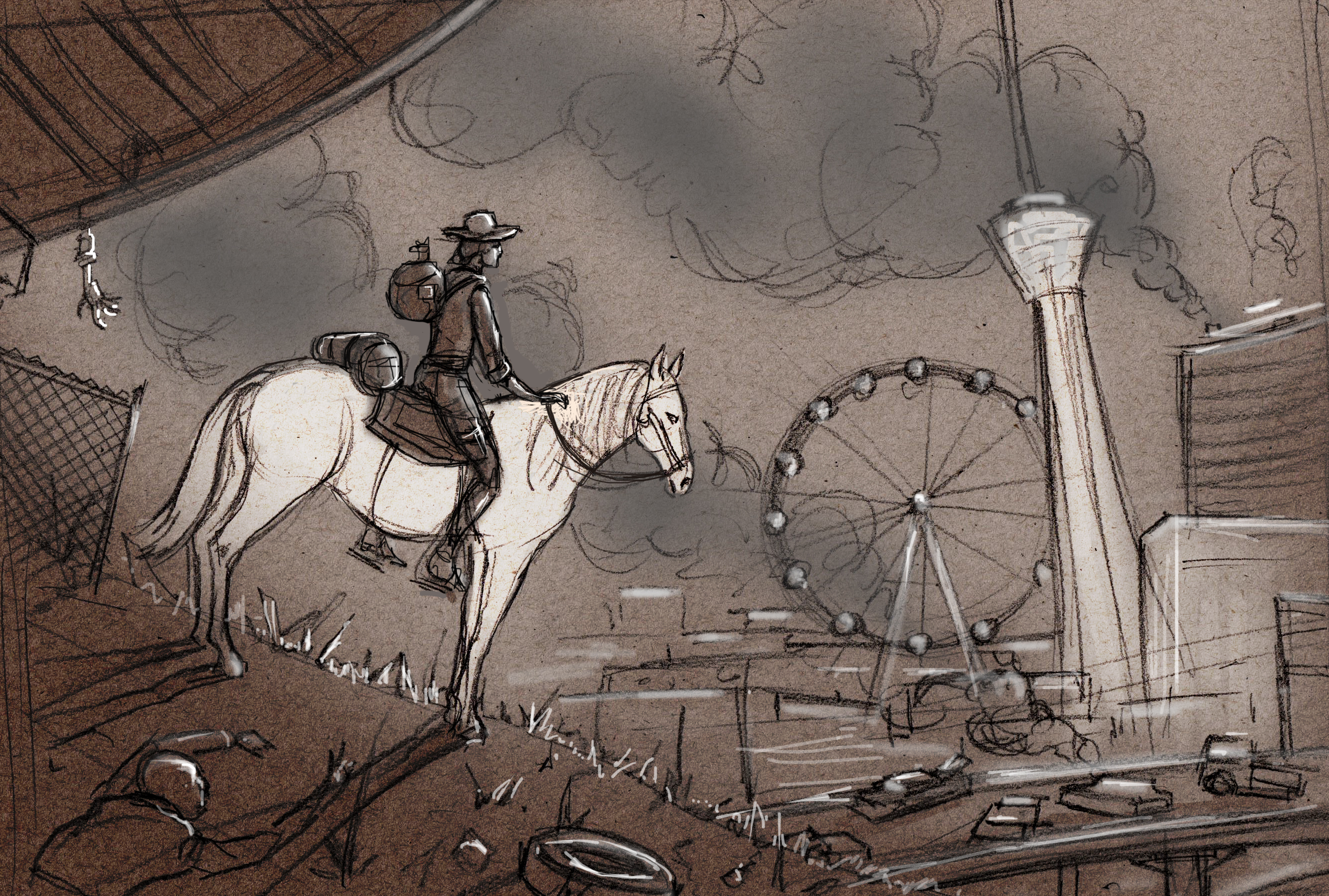 The next ten minutes everyone was in motion. Brandon described the dire situation and everyone sprang to action. Each person had a task but all supporting their single agreed-upon goal–leave the farm as soon as possible. With Brandon’s motorcycle now discarded near advancing flames, and the other broken a year before, all that remained was four-footed transport. The twins readied all six of the farm’s horses—the two that had been with the farm for years plus the four others that had been scavenged from the wilds surrounding the farm. Two of these horses were strapped to the old wagon. Betsy, Ally and Katey loaded as much weapons, food and gear as possible onto the wagon. What was left had to be safely carried on the horses’ saddlebags.