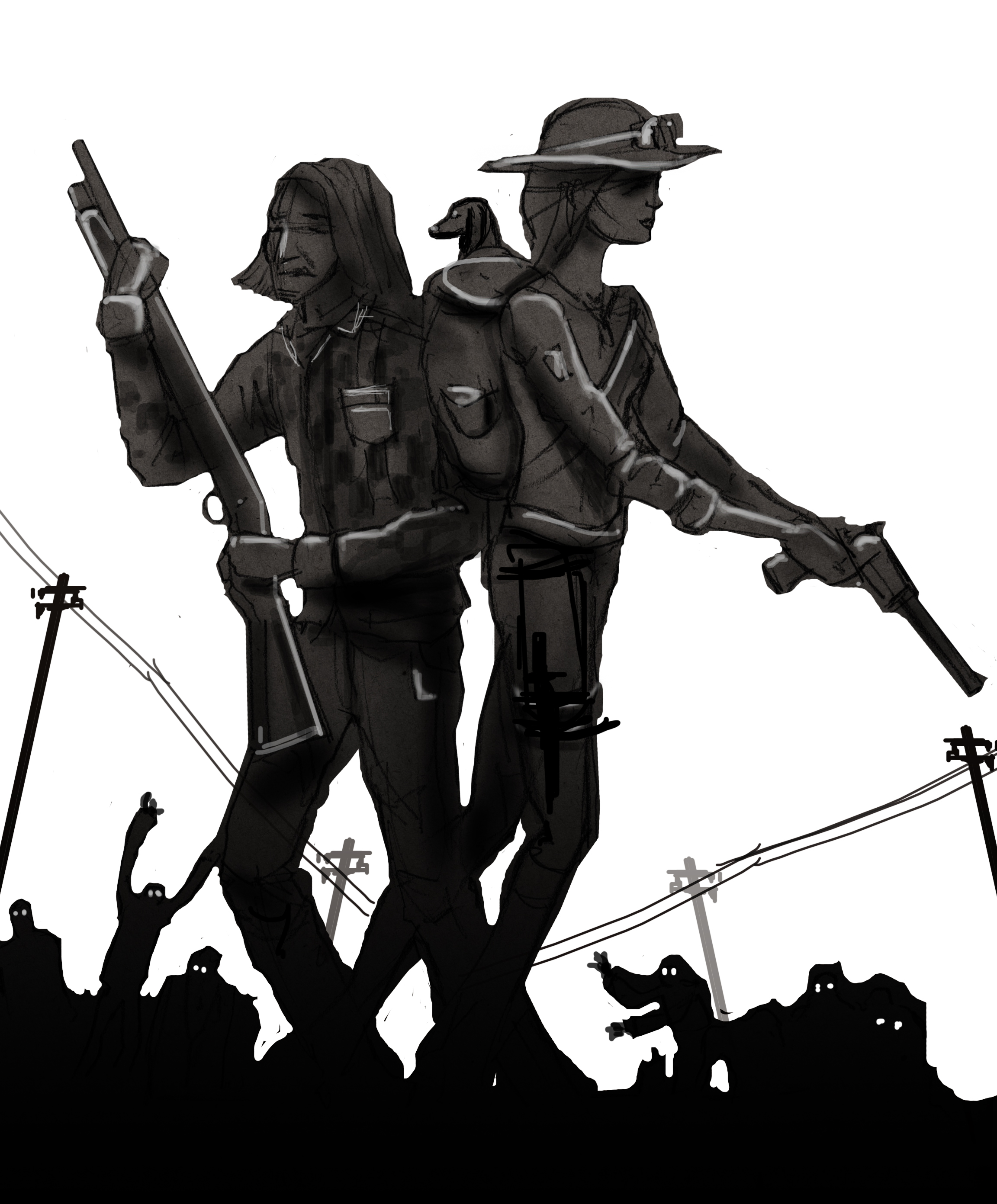 Safe for the moment, Sam stopped her climb–she needed her hands free. Perilously holding on to the post with only her leg’s strength, Sam reached into her back pocket and pulled out and put on her well-worn leather gloves. Looking down at her pursuers, the zombies now completely on fire still stared up towards her unwilling to give up their pursuit. However, more concerning than the dead were the flames–one of the hoist’s posts had now caught fire.